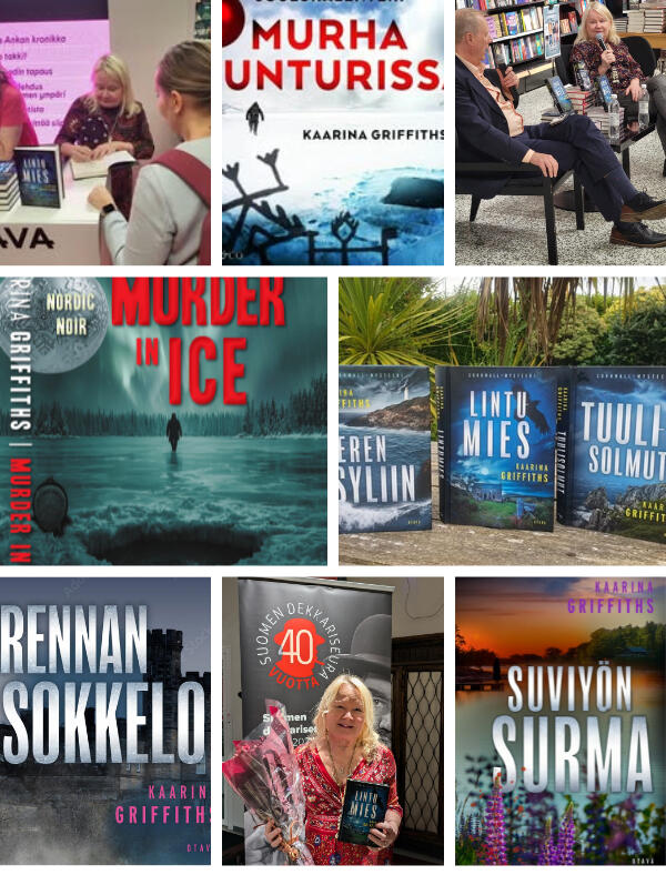 Kaarina Griffiths has published six crime books for Finnish readers. The Cornwall Murder Mystery-series, published by prominent publisher, Otava, is set in real Cornish villages. The stories weave together village legends and fictional murder plots: Meren syliin (The Mermaid´s Death) explores the legend of Zennor´s mermaid, Lintumies (The Birdman) the "Owlman of Mawnan Smith" and Tuulisolmut (The Wind Knots) the legend of Boscastle´s witches, who used to sell windknot-amulets to sailors. Lintumies was shortlisted for The Best Finnish Crime Book of the Year 2024. (read more in section Cornwall series).Kaarina´s first bestseller, Murha tunturissa - Murder in Ice, is now available for the English audience (see section Murder in Ice). The Finnish version of the book was a 2023 Christmas bestseller across the streaming platforms BookBeat and Storytell. It was published by Swedish publisher, Lind & Co, as a 24-part Advent Calendar – later as a whole book. In its English edition, the story unfolds across 25 chapters. Readers can enjoy one chapter a day in the countdown to Christmas – or simply as a compelling crime novel to read in one sitting.Earlier Novels: